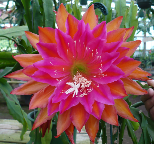 innere Petalen orange mit schmalen roten Rändern. Nächste Reihe orange mit breiten purpurrosa Rändern. Nächste zwei Reihen purpurrosa mit orangem Mittelstreifen und hellvioletten Rändern. Äussere Petalen orange mit roten Rändern.  |