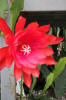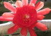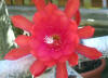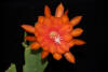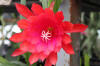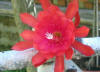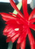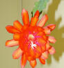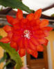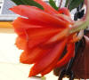 orange-rote innere Petalen mit gekräuselten Rändern, nächste Reihe und äussere Petalen türkisch rot. |