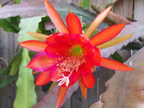 tief orangerosa innere Petalen mit fuchsia Rändern, Petalenspitzen nach innen gedreht. Äussere Petalen tief lachsrot mit grünlichem Schimmer. |