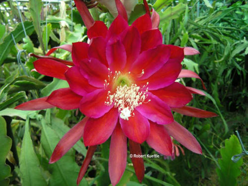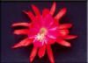 kräftig kirschrot mit breitem rot-orangem Mittelstreifen, hellere kirschrote Ränder im Schlund, nächste Reihe kräftig rot-orange mit kirschroten Rändern bis zur Hälfte der Petalen, äußere Petalen orange-rot mit kirschrot an der Basis der Petalen |