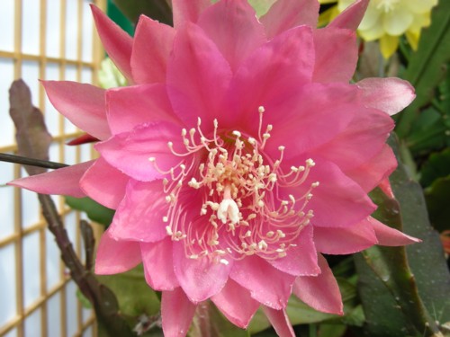 innere Petalen karmin mit kirschrot schattierten Rändern und Schlund. Nächste Reihe lachsfarben mit zart karmin Rändern. Äussere Petalen lachsfarben mit hellerem Mittelstreifen. |