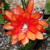 leuchtend orange mit fuchsiafarbigem Schlund, äußere Petalen indisch-rot mit orangefarbenem Mittelstreifen |