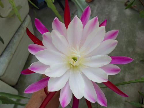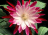 weiss mit fuchsia Mittelstreifen und Spitzen, zweite Reihe glänzend rote Mitte und fuchsia Ränder. Alle inneren Petalen gekräuselt und gestreift. Äussere Petalen tief blutrot und etwas zurückgebogen. |