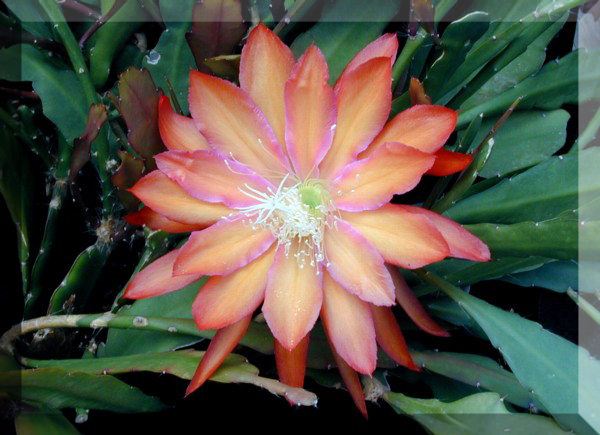 innere Petalen leicht goldorange mit magenta bis weißen Rändern im Schlund, nächste Reihe goldorange mit einem Hauch karmin an den Rändern, äußere Petalen dunkelorange mit roten Rändern |