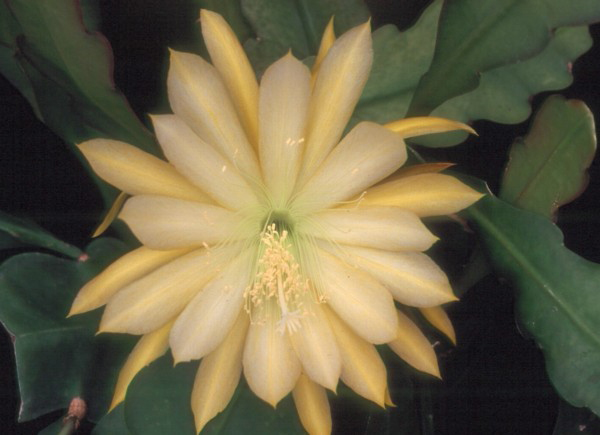 hellgelb mit dunklerem gelbem Mittelstreifen, äußere Petalen gelb |