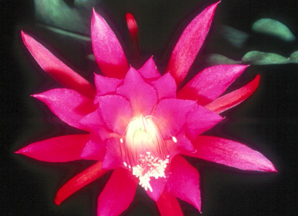 fuchsienfarben mit rotem Mittelstreifen, äußere Petalen rot |