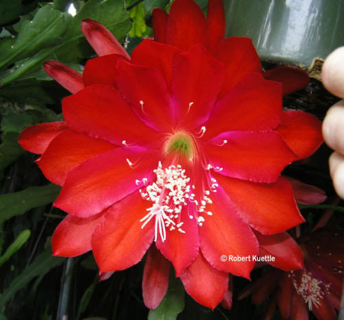 rot mit zartem kirschroten Hauch im Schlund. Äussere Petalen tief rot. |