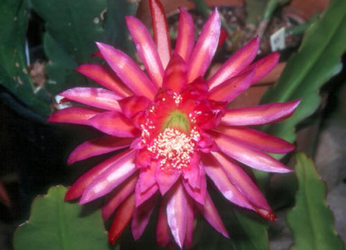 hell purpur mit einem leicht orange Mittelstreifen, äußere Petalen mittleres rötlich-purpur. |