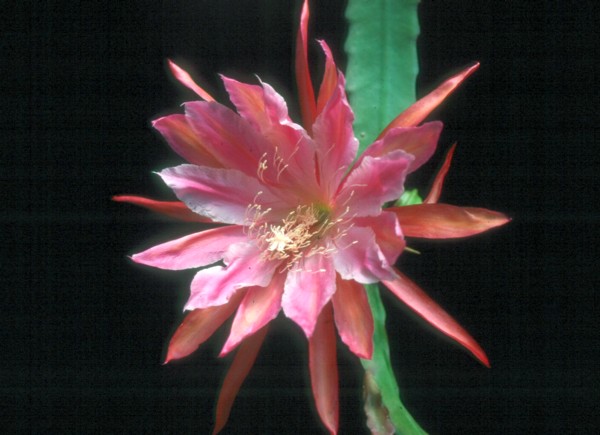 lachsorange mit orchideenfarbenem Mittelstreifen und pinkfarbenem Schlund, außen wassermelonenrot, gekräuselt |