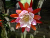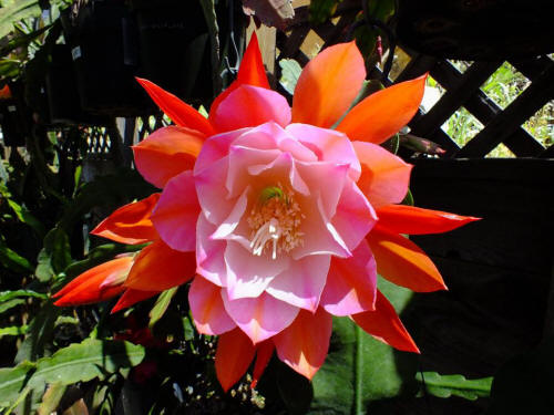 innere Petalen zartrosa mit weisslich rosa Schlund. Äussere Petalen orange. |