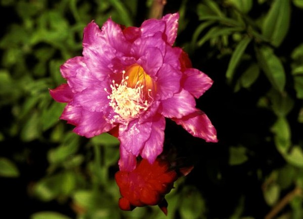 dunkles rosa mit weissem Schlund und weissen Sprenkeln. Silberner Schimmer auf den Petalen. |