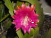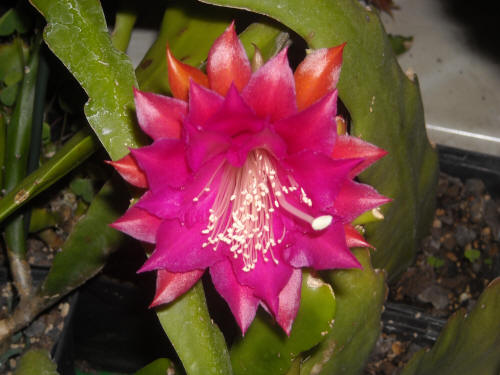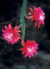 innere Petalen rot-violett. Äussere Petalen apricot mit violett-rotem Mittelstreifen. |