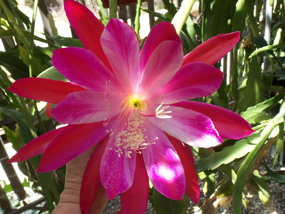 leuchtend purpur-lavendel zu einem weissen Schlund verlaufend. Äussere Petalen rötlich orange. |