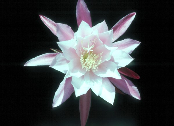 fahles pink, wenige Tupfen, etwas gewellt, die nächsten Reihen ein wenig dunkler pink, äußere Petalen dunkel rose |