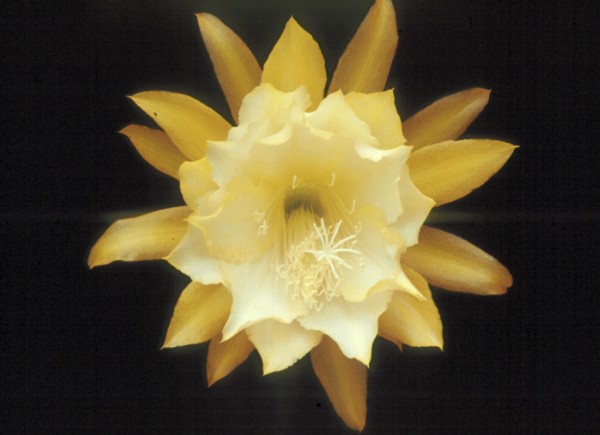 hell bis dunkler gelb, gewellte Ränder und wenige Tupfen, nächste Reihe mit Mittelstreifen in dunklerem gelb, äußere Petalen in mittlerem gelb mit rötlichem pink |