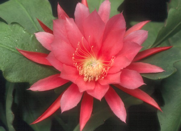 pink, etwas dunkler im Zentrum, roter Schlund, äußere Petalen gelbbraun mit pinkfarbenem Mittelstreifen |