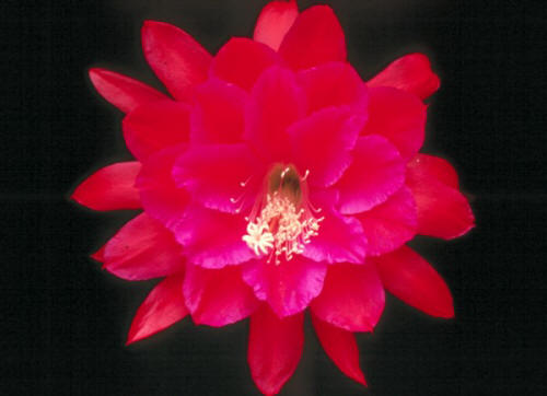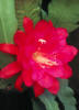 innere Petalen rot mit gekräuselten, kirschroten Rändern, nächste Reihe rot mit karminfarbenen Rändern, äußere Petalen dunkles rot mit hellerem Mittel-streifen |