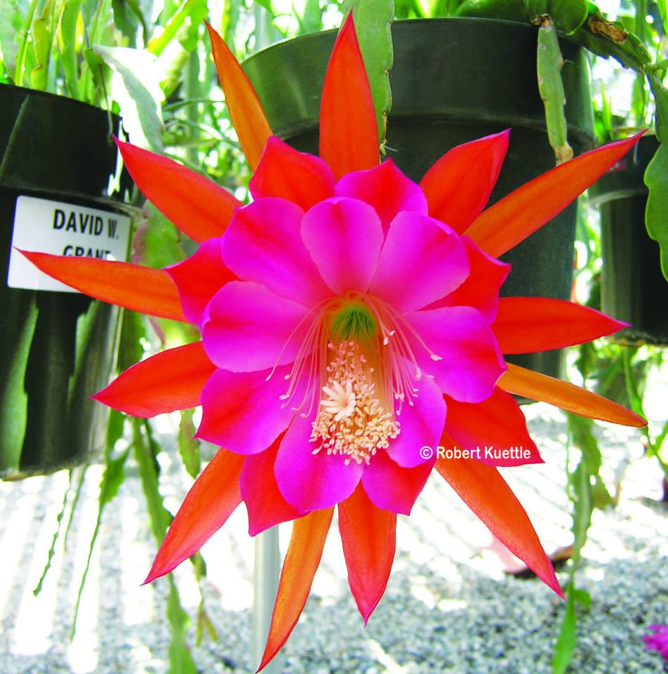 erste Reihe orange mit fuchsia Rändern. Zweite Reihe orange nach rot verlaufend. Äussere Petalen hell orange. |