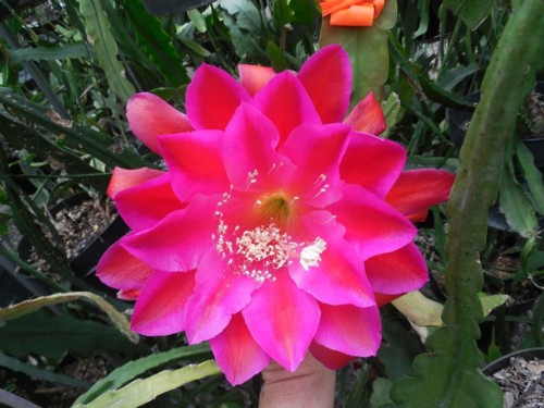 purpurlila mit truthahnrotem Mittel-streifen. Äussere Petalen gardistenrot. |