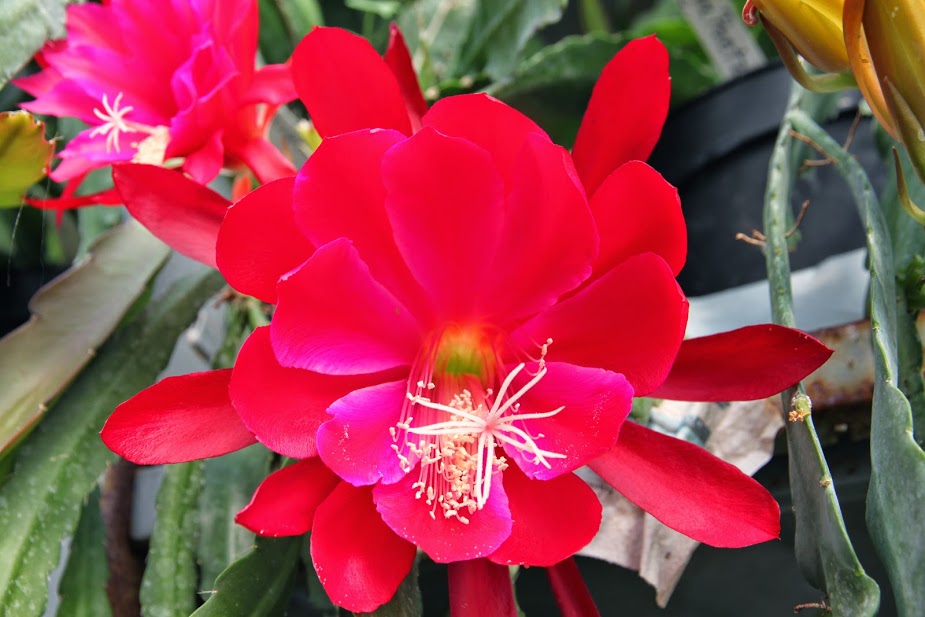 innere Petalen magenta mit helleren bis weissen Rändern und orangerotem Mittelstreifen. Nächste Reihe tief rot mit etwas hellerem Mittelstreifen. Äussere Petalen tief rot mit etwas hellerem Mittelstreifen. |