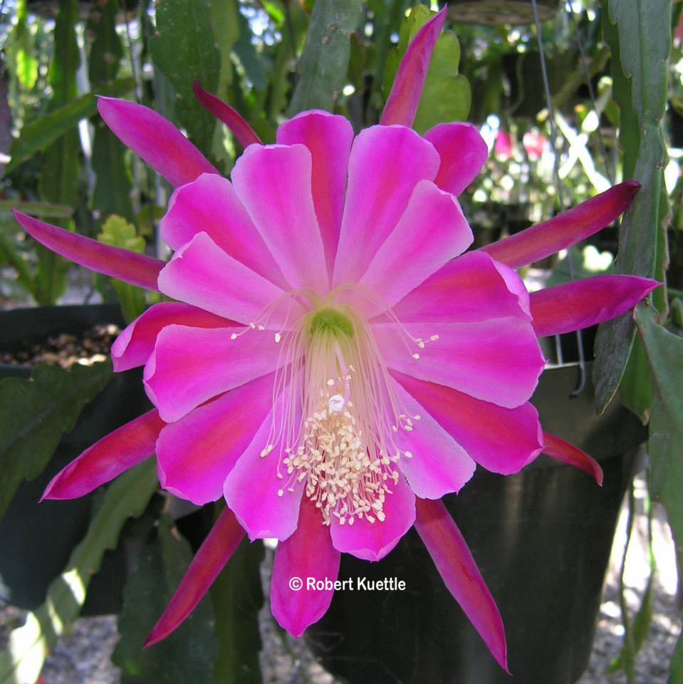 violett-magenta mit lachsfarbenem Mittelstreifen. Weisser Schlund. Äussere Petalen hellrot mmit purpur-violett an den Rändern, gedrehte Petalen. |