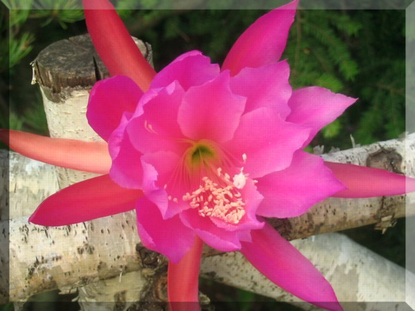 dunkel magenta mit dunklerem Mittelstreifen. Äussere Petalen rot-orange. |