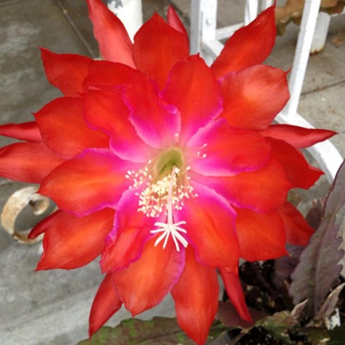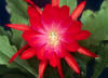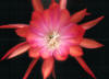 4 Reihen Petalen, die 1.Reihe hat einen weißen Schlund und geht dann von hell lavendel bis zu kirschrot mit dunkel orange, 2. Reihe orange mit kirschrot an den inneren Rändern sowie breiten gold-orangenen Mittelstreifen, 3. und 4.Reihe orange, äußere Petalen orange-rot |