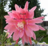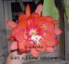 tiefes korallenrosa mit hellerem Schlund. Petalen zart gekräuselt und gesprenkelt in kirschrot und hellem orange. Nächste Reihe tief korallenrosa mit karminfarbenen Rändern und hellorangem Mittelstreifen. |