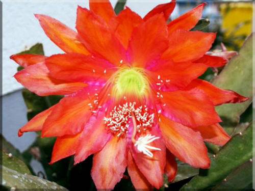 feuerrot mit fuchsienfarben-purpur Rändern, äußere Petalen signalrot |