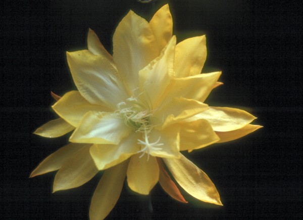 dunkel gelbgold reichlich an den inneren und äußeren Petalen, alle Petalen gewellt und gedreht, keine 2 Blüten derselben Pflanze sind identisch, unregelmäßige Petalen und Form |
