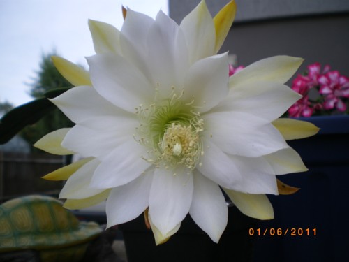 zart gelb mit dunklerem Mittelstreifen. Äussere Petalen lang |