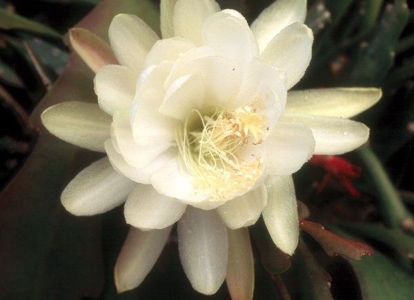 cremefarben, äußere Petalen cremefarben mit grünlich-pinkfarbenem Mittelstreifen |