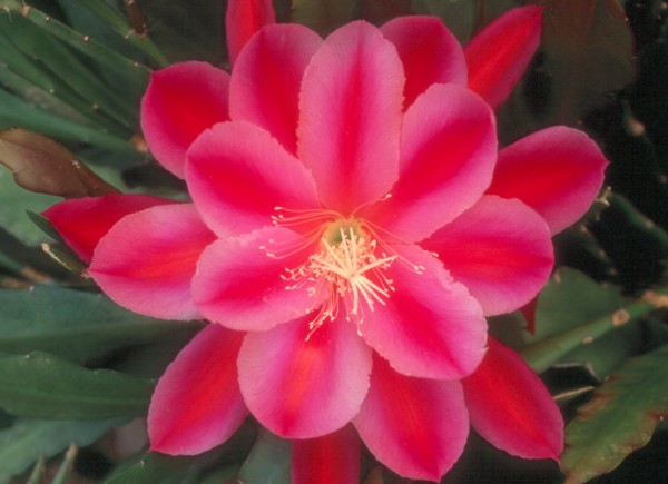 innere Petalen kirschrot mit etwas kirschrot bis weißen Rändern und Mittelstreifen in mittlerem orange, nächste Reihe dunkler, äußere Petalen orangerot mit kirschroten Rändern |