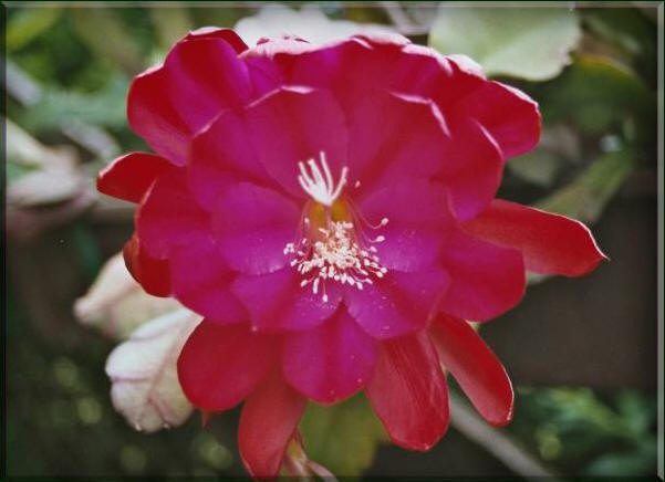 leuchtend dunkelpurpur mit orangem Mittelstreifen und Spitzen, äußere Petalen leuchtendes rotorange mit violetten Rändern |