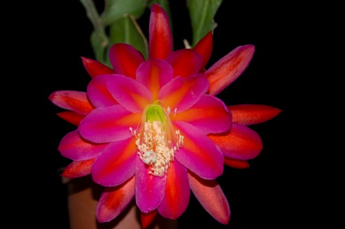 rot mit orangem Mittelstreifen, purpur Rändern und hell purpur bis weiß im Schlund, äußere Petalen dunkelrot |