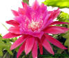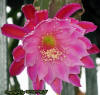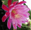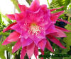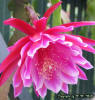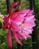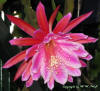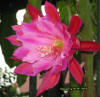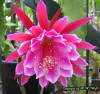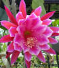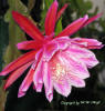 innere Petalen zur Hälfte dunkles orange, rhodamine purpur zum Schlund hin, gewellt, 2 Reihen dunkles orange, äußere Petalen dunkel orangerot |