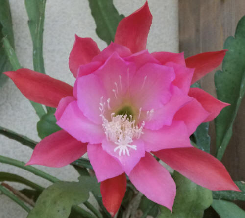 innere Petalen hell purpur, nächste Reihe tiefes rosarot. Äussere Petalen ziegelrot. |