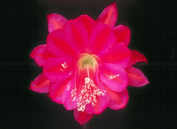 breite gerundete Petalen in kräftigem kirschrot mit orangerotem Mittelstreifen, äußere Petalen orangerot mit karmin schattiert bis zu kirschroten Rändern |