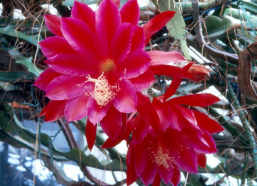 feurig orange mit dunkel purpur übertönt, breite karminfarbene Ränder, äußere Petalen orange mit karminfarbenen Rändern |