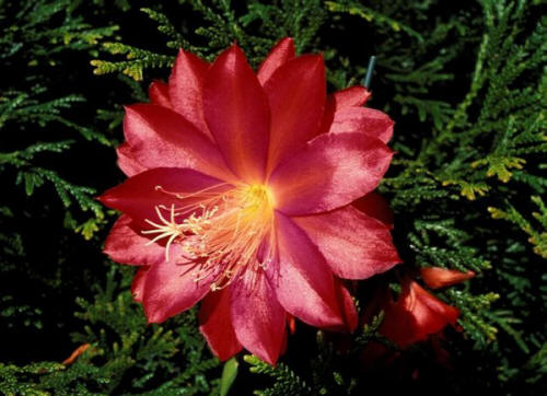 Innere Petalen mohnrot von lachsrot durchzogen mit violett rotem Schlund. Äussere Petalen lachsrot. |