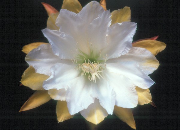 1.Reihe gelb mit weißem Mittelstreifen, 2.Reihe weiß mit gelben Tupfen und gewellt, äußere Petalen gelb mit orangem Mittelstreifen |