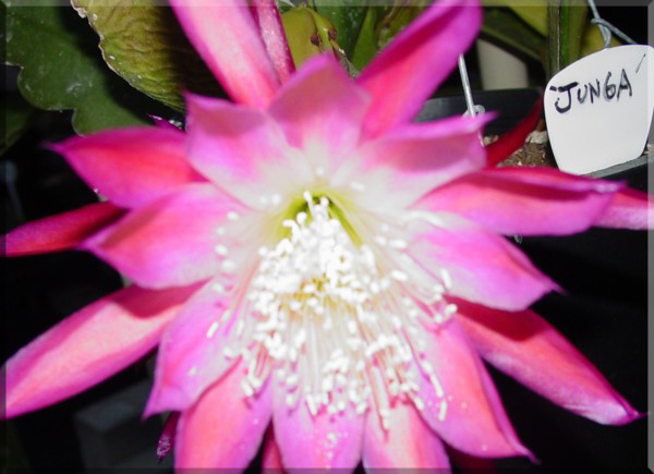 dunkelrot mit etwas fuchsienfarben im Schlund und an den Rändern, außen gedrehte Petalen |