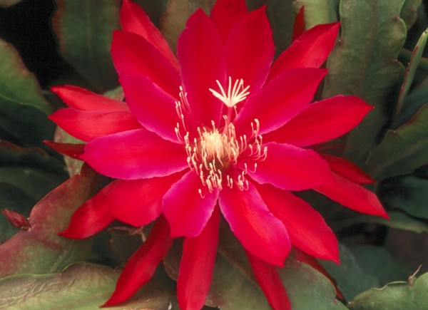 innere Petalen magenta mit roten Tupfen, nächste Reihe dunkles kräftiges rot, äußere Petalen burgunderrot |