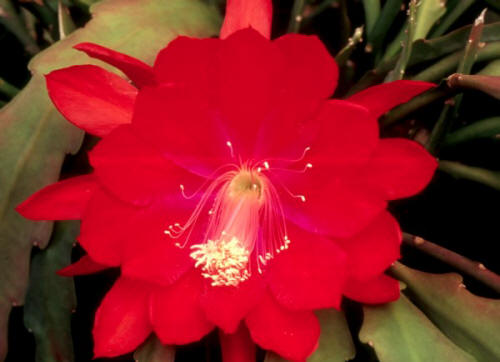 innere Petalen dunkel rot-orange mit kirschroten Rändern, äußere Petalen dunkel rot-orange mit hellerem Mittelstreifen |