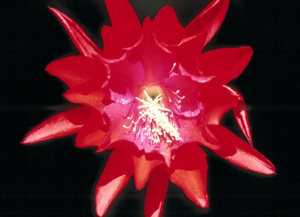 kräftig rot-orange mit kirschroten Rändern, die Petalen haben gewellte Ränder, äußere Petalen dunkel rot-orange |