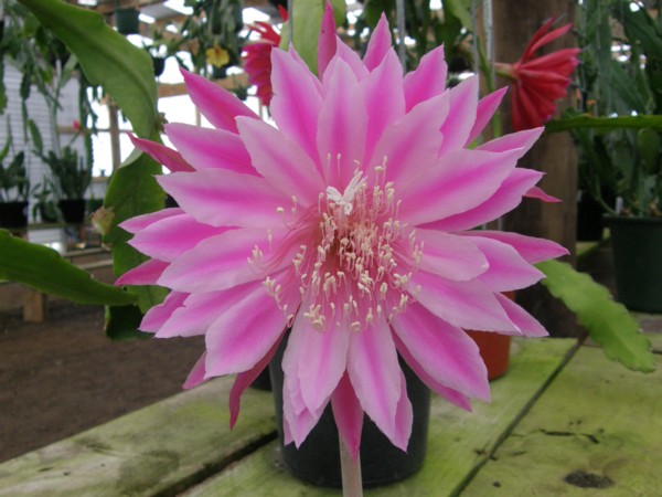 Erste Reihe der inneren Petalen rosa-purpur. Nächste zwei Reihen hell rosa mit purpur Mittelstreifen. Äussere Petalen purpur mit rotem Mittelstreifen. |