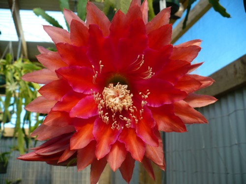 erste Reihe der inneren Petalen orangerot mit dunkler orangerotem Mittelstreifen, Nächste Reihen komplett orangerot. Dritte und vierte Reihen orangerot mit purpur Rändern. Äussere Petalen dunkel rosarot mit orangerotem Mittelstreifen. |