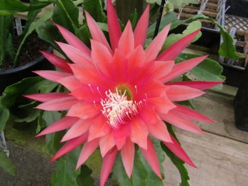 erste Reihe der inneren Petalen komplett dunkel rosarot. Zweite Reihe orangerot mit dunkler orangerotem Mittelstreifen. Nächste Reihe orangerot mit purpur Basisrand. |