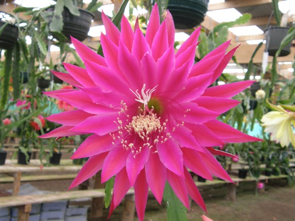 erste Reihe purpur mit dunkel rosarotem Mittelstreifen. Nächste Reihe dunkel rosarot mit purpurrosa Rändern. Dritte Reihe purpurrosa mit rosarotem Mittelstreifen. Äussere Petalen purpur. |