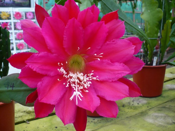 innere Petalen dunkel rosarot mit breten purpurrosa Rändern. Nächste zwei Reihen pupurrosa mit dunkel rosarotem Mittelstreifen. Grüner Schlund. Äussere Petalen dunkel rosarot mit dünnen purpurrosa Rändern. |